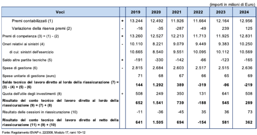 È una tabella di “alto profilo”, per cui va letta con tutte le dovute precauzioni, tenuto conto che il saldo tecnico al lordo della riassicurazione passa da −96 a −219 (peggioramento di 123 milioni). I premi di competenza crescono di circa 906 milioni (+7,5%) e i sinistri aumentano di circa 867 milioni (+9,2%), quindi meno dei premi di competenza, e le spese di gestione di 121 milioni (+4,8%).