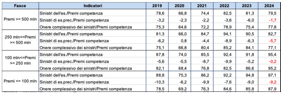 Il secondo livello è il rapporto s/p 2024 dove la fascia delle imprese medio-alte (250 mln<=Premi>=500 mln) si sono allineate alle “grandi” in un’area di “quasi” confort zone, mentre per le altre imprese l’andamento tecnico si conferma molto negativo.