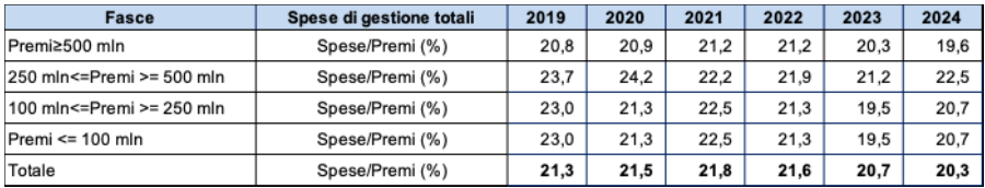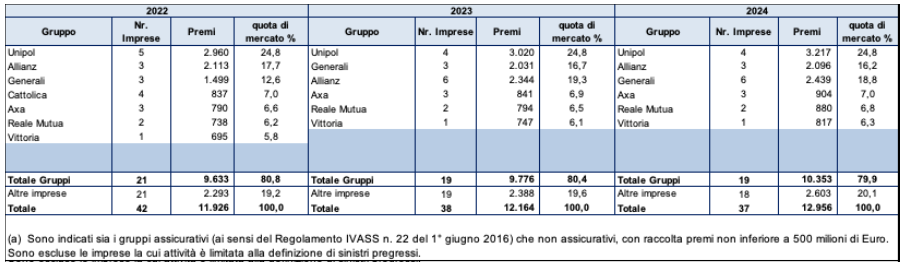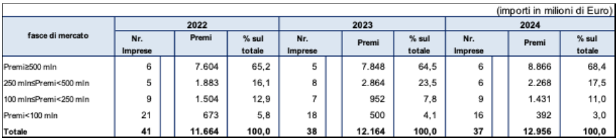 La Tavola n. 3: Ramo R.C. auto e natanti – Distribuzione dei premi lordi contabilizzati per fasce di mercato, ci dà le informazioni per interpretare lo scenario del business, per cui possiamo dire che nel 2024 c’erano 25 imprese che, complessivamente (va sottolineato), non erano performanti.