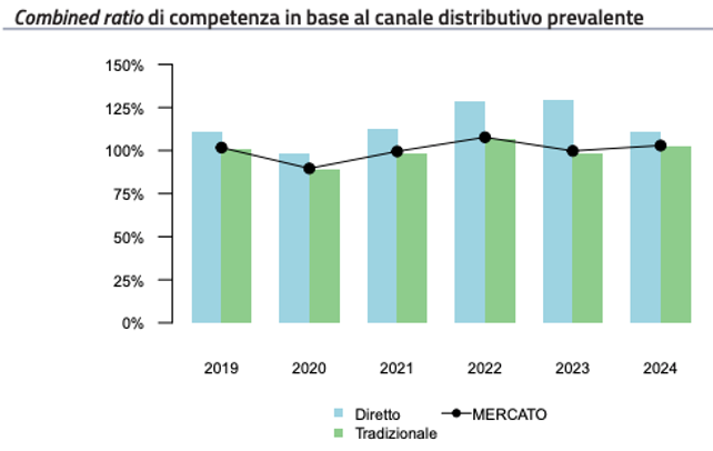 Premesso che le Tavole del Bollettino richiederebbero molte più riflessioni, cerchiamo di tirare delle conclusioni di buon senso assicurativo. Abbiamo una fotografia per canale distributivo dove è confermato la performance migliore delle imprese che utilizzano il canale tradizionale (102,2%) rispetto a quelle dirette (110,7%). Dal report di IVASS è ovvio che le imprese dirette devono essere intervenute sui premi nel 2024 con incrementi importanti per migliorare di oltre 10 punti percentuali il combined ratio.