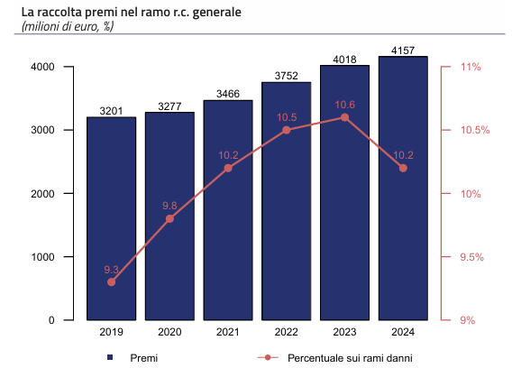 raccolta complessiva dei rami danni (in leggero calo rispetto al 10,6% del 2023 dopo 4 anni di aumenti consecutivi).