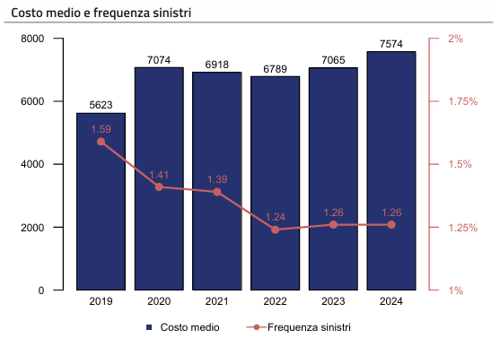 Aumenta invece il costo medio dei sinistri, che si attesta a 7.574 euro (+7,2%