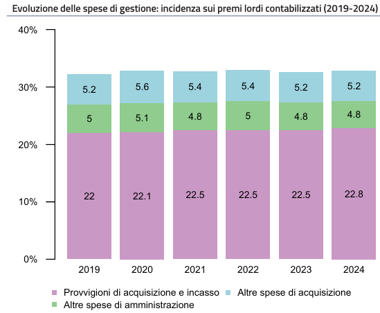 Le provvigioni – principale voce di spesa di gestione – incidono per il 22,8% sui premi contabilizzati; le ulteriori componenti dell’expense ratio (spese di acquisizione e amministrazione) incidono rispettivamente per il 4,8% e il 5,2%. Il contributo delle voci di spesa risulta stabile nel periodo d’osservazione.