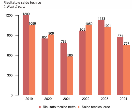 Nonostante il risultato tecnico, al netto della riassicurazione, rimanga positivo per 871 milioni di euro, si registra un sensibile calo (-23,1%) rispetto al 2023, principalmente a causa dell’aumento degli oneri per sinistri, passati da 1.561 milioni a 1.933 milioni di euro nel 2024. Tale dinamica si riflette nel saldo tecnico, che si riduce da 1.024 milioni a 757 milioni di euro. L’aumento dei premi di competenza (+4,5%) contribuisce solo parzialmente a compensare la crescita del costo dei sinistri.