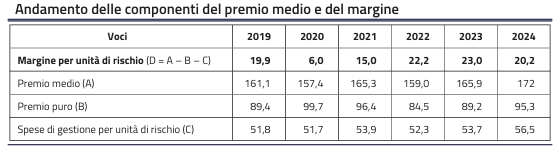 Il margine tecnico atteso per unità di rischio è pari a 20,2 euro, in lieve riduzione rispetto ai 23 euro del 2023, a causa dell’aumento del premio puro, che ha assorbito totalmente la crescita del premio medio e della crescita delle spese di gestione. L’andamento segnala quindi un equilibrio ancora favorevole della gestione tecnica, ma con una progressiva compressione della redditività rispetto all’anno precedente.