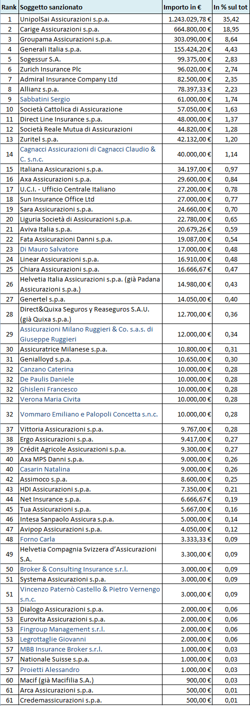 A guidare le classifiche per importo è sempre UnipolSai, con 57 sanzioni per un totale di 1.243.029,78 € (di cui 868.325 attribuibili a FonSai). Seguono Carige(664.800 €)e Groupama (303.090 €).