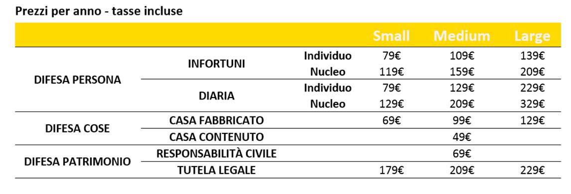 Nella tabella di seguito sono elencati i livelli di costo annuo per ogni copertura offerta dal pacchetto:
