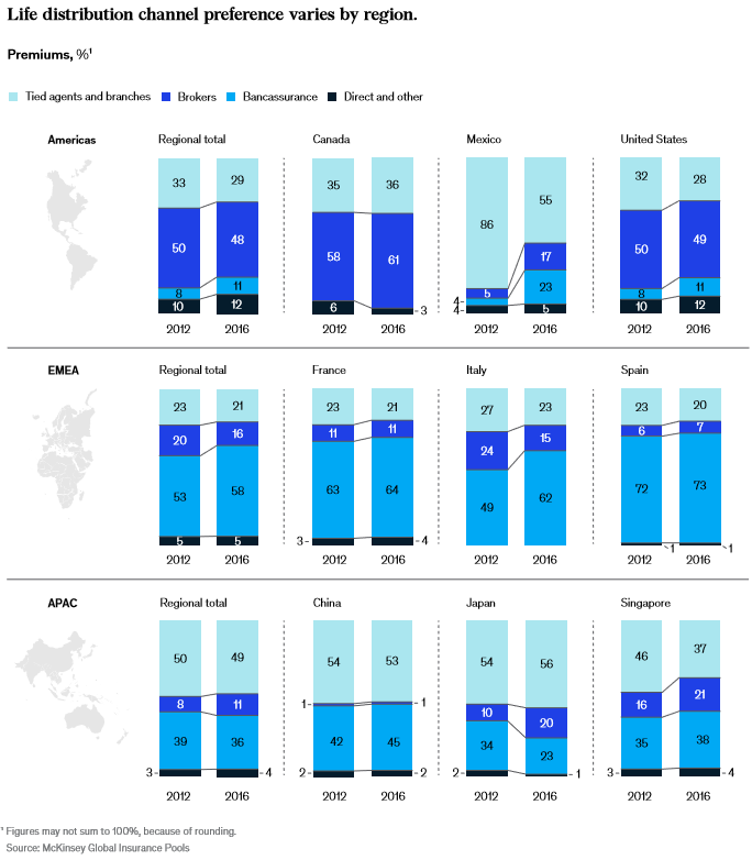Nelle assicurazioni sulla vita, il panorama distributivo varia da una regione all’altra. Il mix distributivo nelle varie regioni riflette le tendenze dei mercati locali e le preferenze dei consumatori, poiché gli assicuratori lavorano con i distributori per adattare i prodotti e una strategia di vendita in linea con l’ambiente locale.