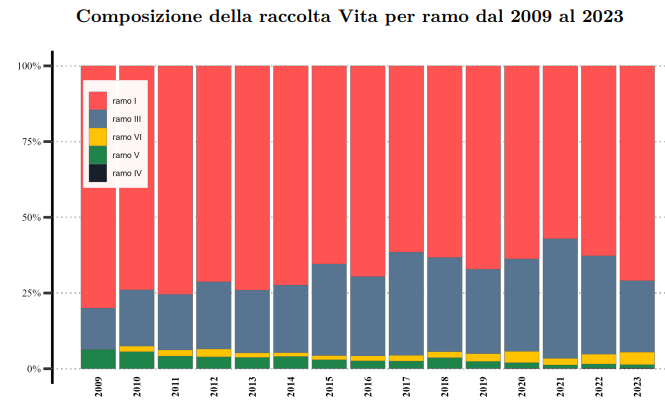 Il ramo VI – relativo ai Fondi Pensione – è in crescita (+22,9% sul 2022, raggiungendo il 4,1% dell’intera raccolta Vita).