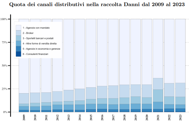 La quota sul totale danni della raccolta tramite Sportelli bancari e postali nel 2023 si stabilizza all’8,3%. Cresce l’incidenza dei Brokers e delle Agenzie in economia e gerenze, mentre per le Agenzie con mandato si osserva una lieve riduzione, al 68,7%.