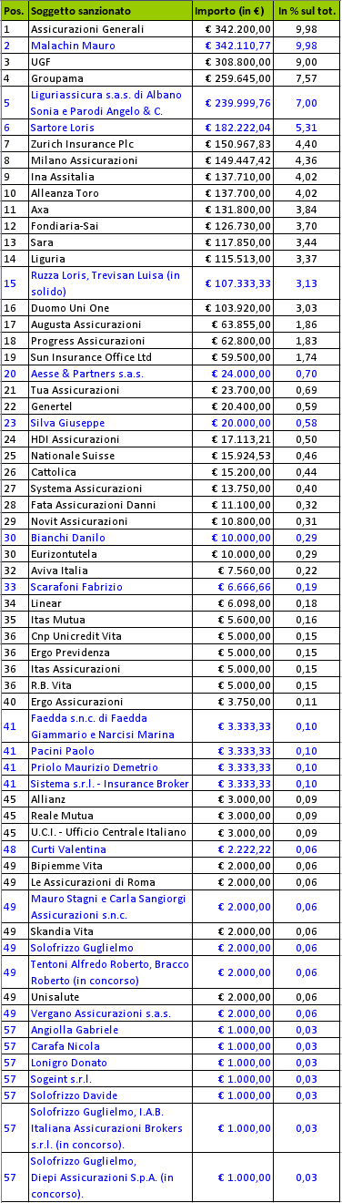 – Liguriassicura s.a.s. di Albano Sonia e Parodi Angelo & C. € 239.999,76, per mancata osservanza delle regole di diligenza, correttezza e trasparenza nei confronti della clientela in n. 54 occasioni.