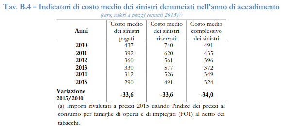 Sinistri denunciati nell’anno di accadimento. Il costo medio dei sinistri risarciti nello stesso anno di accadimento è stato pari a 290 euro per il 2015 (312 euro per la generazione 2014). L’ammontare medio stanziato a riserva, in previsione di esborsi futuri, è stato pari a 491 euro per la generazione sinistri del 2015, in lieve diminuzione rispetto al 2014 (526 euro). Il costo medio complessivo (per il totale dei sinistri pagati e iscritti a riserva) ammonta a 324 euro per la generazione 2015, praticamente invariato rispetto al 2014.