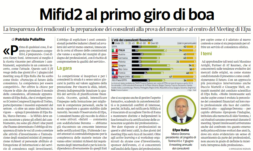 Attrezzarsi al meglio è la ricetta vincente per affrontare i cambiamenti, soprattutto in un contesto incerto, come l’attuale. Questo sarà il fil rouge della due giorni (6 e 7 giugno) del meeting 2019 di Efpa Italia che ha scelto come titolo: «Partecipa al futuro della consulenza. La competenza per essere competitivi». Per offrire la chiave per vincere le sfide che attendono il mondo della consulenza, all’annuale appuntamento di Efpa Italia, che si svolgerà presso il Centro Congressi Lingotto di Torino, parteciperanno i massimi esponenti del settore.