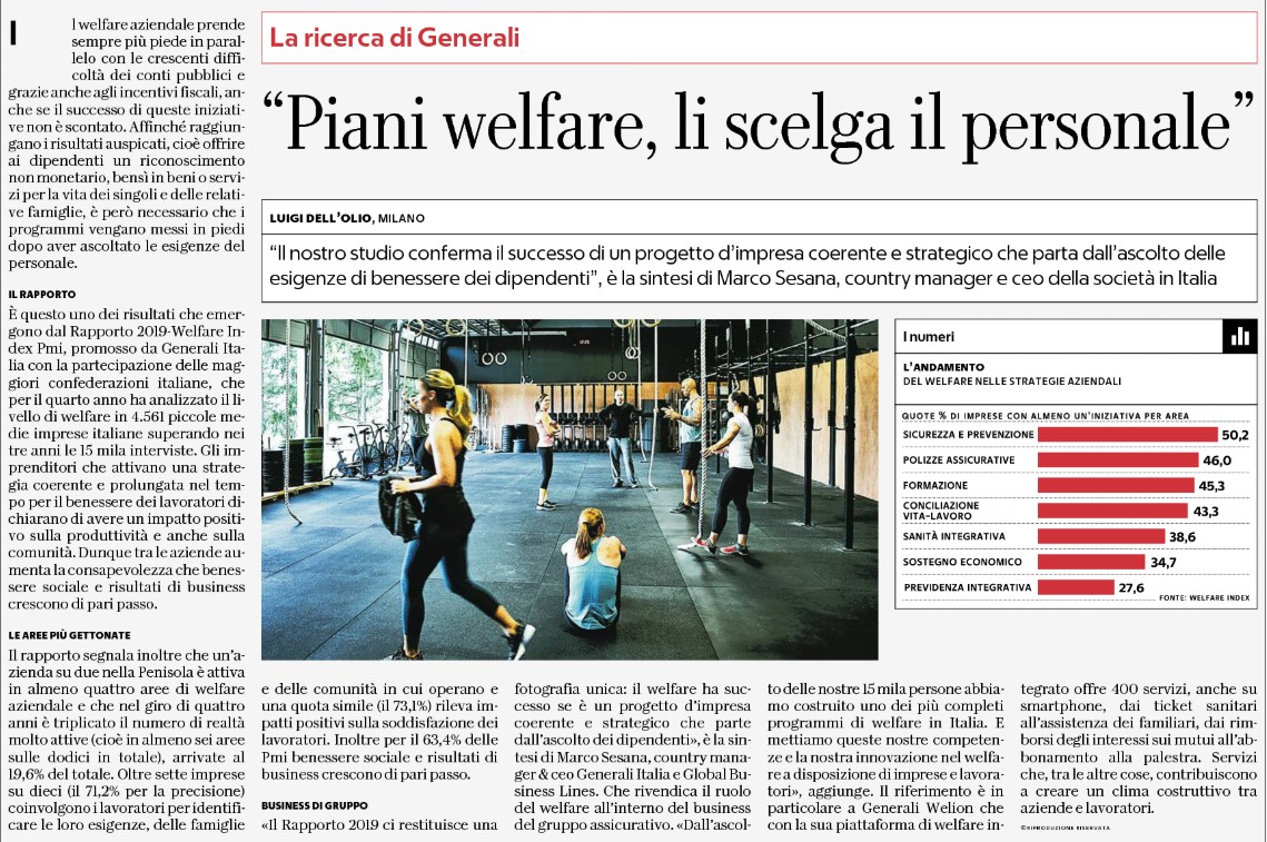 È questo uno dei risultati che emergono dal Rapporto 2019-Welfare Index Pmi, promosso da Generali Italia con la partecipazione delle maggiori confederazioni italiane, che per il quarto anno ha analizzato il livello di welfare in 4.561 piccole medie imprese italiane superando nei tre anni le 15 mila interviste.