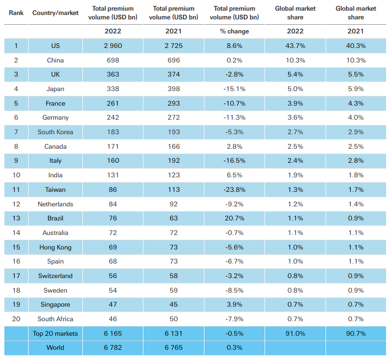 Gli Stati Uniti sono e restano il più grande mercato assicurativo del mondo, con premi totali per quasi 3.000 miliardi di dollari nel 2022, secondo i dati di sigma. La sua quota di mercato globale è passata dal 40% al 44%, grazie alla forte crescita dei premi in termini nominali (8,6%) e all’apprezzamento del dollaro USA rispetto a quasi tutte le principali valute. La Cina è il secondo mercato per importanza, con un volume di premi pari a 698 miliardi di dollari. Il Regno Unito è salito al terzo posto lo scorso anno con premi per 363 miliardi di dollari, scambiando la posizione con il Giappone, che ora si trova al quarto posto.