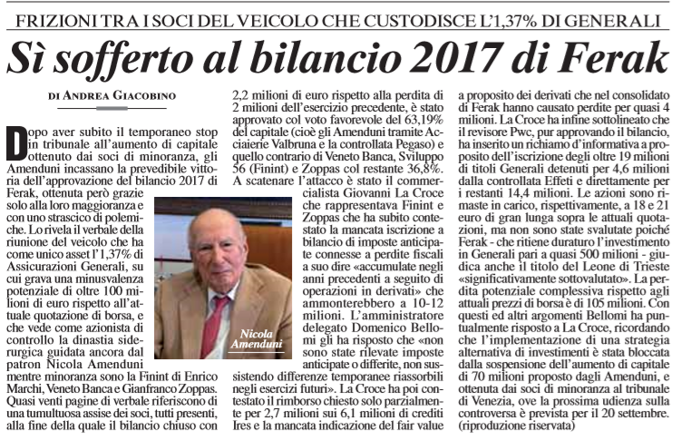 Dopo aver subito il temporaneo stop in tribunale all’aumento di capitale ottenuto dai soci di minoranza, gli Amenduni incassano la prevedibile vittoria dell’approvazione del bilancio 2017 di Ferak, ottenuta però grazie solo alla loro maggioranza e con uno strascico di polemiche. Lo rivela il verbale della riunione del veicolo che ha come unico asset 1’1,37% di Assicurazioni Generali, su cui grava una minusvalenza potenziale di oltre 100 milioni di euro rispetto all’attuale quotazione di borsa.