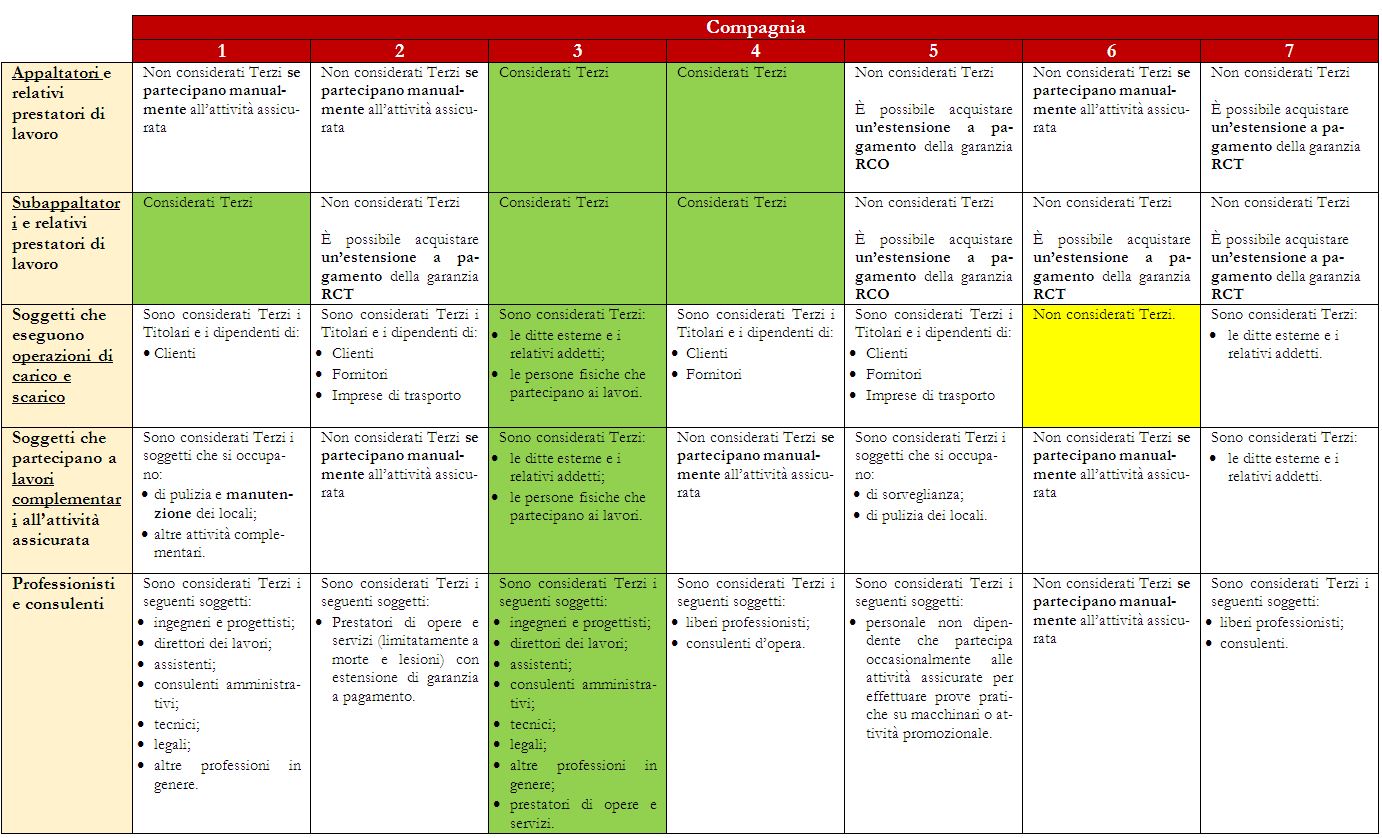 Si ricorda che l’Assicurato non è tutelato dalla polizza in tutti i casi in cui la richiesta di risarcimento venga presentata da un soggetto che non è considerato Terzo, da qui l’importanza di conoscere le differenze tra le polizze delle diverse Compagnie, sintetizzate nella seguente tabella.