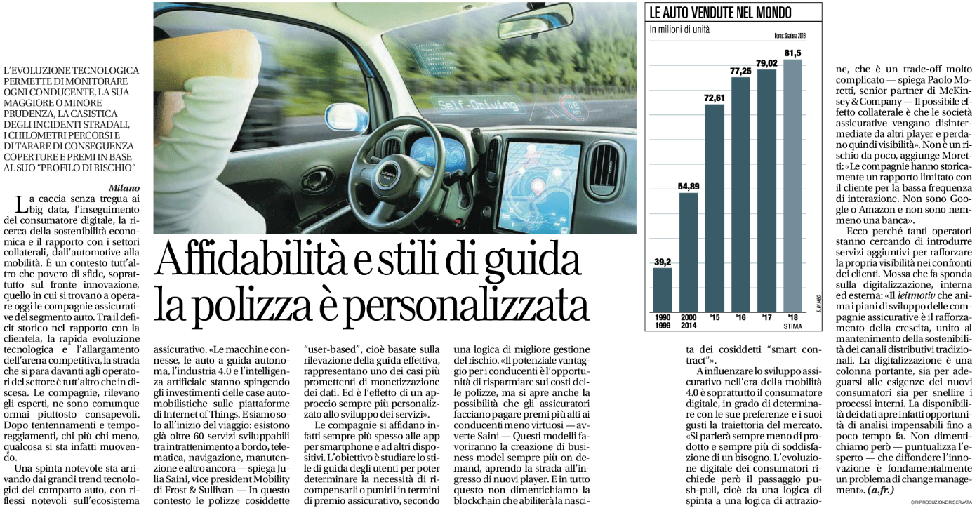 La caccia senza tregua ai big data, l’inseguimento del consumatore digitale, la ricerca della sostenibilità economica e il rapporto con i settori collaterali, dall’automotive alla mobilità. È un contesto tutt’altro che povero di sfide, soprattutto sul fronte innovazione, quello in cui si trovano a operare oggi le compagnie assicurative del segmento auto. Tra il deficit storico nel rapporto con la clientela, la rapida evoluzione tecnologica e l’allargamento dell’arena competitiva, la strada che si para davanti agli operatori del settore è tutt’altro che in discesa. Le compagnie, rilevano gli esperti, ne sono comunque ormai piuttosto consapevoli. Dopo tentennamenti e temporeggiamenti, chi più chi meno, qualcosa si sta infatti muovendo. Una spinta notevole sta arrivando dai grandi trend tecnologici del comparto auto, con riflessi notevoli sull’ecosistema.