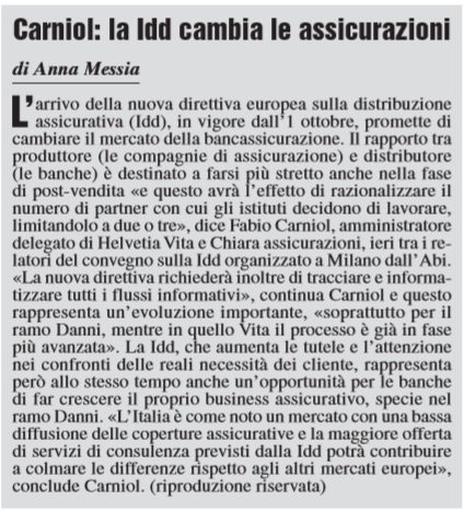 L’arrivo della nuova direttiva europea sulla distribuzione assicurativa (Idd), in vigore dal 1 ottobre, promette di cambiare il mercato della bancassicurazione. Il rapporto tra produttore (le compagnie di assicurazione) e distributore (le banche) è destinato a farsi più stretto anche nella fase di post-vendita «e questo avrà l’effetto di razionalizzare il numero di partner con cui gli istituti decidono di lavorare, limitandolo a due o tre», dice Fabio Carniol, amministratore delegato di Helvetia Vita e Chiara assicurazioni. «La nuova direttiva richiederà inoltre di tracciare e informatizzare tutti i flussi informativi», continua Carniol e questo rappresenta un’evoluzione importante, «soprattutto per il ramo Danni, mentre in quello Vita il processo è già in fase più avanzata».