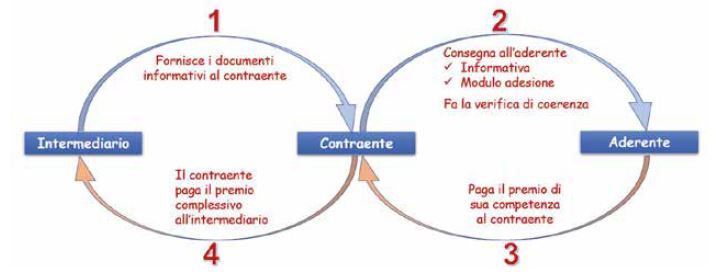 Se invece l’intermediario si avvale della collaborazione del contraente per gli adempimenti dell’informativa nei confronti dell’aderente la filiera assume la seguente configurazione: