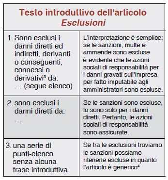 E quindi ovvio che se troviamo l’esclusione delle sanzioni dalla definizione di perdita o danno riportata nel contratto di assicurazione, diviene irrilevante l’analisi dell’articolo esclusioni: sono escluse a priori dai rischi assicurati con l’articolo Oggetto dell’assicurazione.