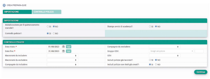 Esatto. Durante la fase di controllo, la funzione estrae le posizioni che sono di fatto quietanzabili – all’interno di un certo periodo – applicando tutta una serie di filtri che consentono di raggruppare il dato per Compagnia, Filiale, macro-rami, ecc. tutto in un’unica maschera. Nel dettaglio, il Broker lancia la funzione che estrae le Polizze in scadenza.
