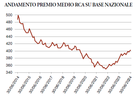 Ci eravamo abituati ad una perdurante decrescita annua del premio medio dei contratti RCA. Per otto anni, dal 2014 fino al 2022, c’è stata una costante diminuzione; poi dal 2022 il premio medio ha ricominciato a crescere: da giugno 2022 a giugno 2024 è salito più del 14% raggiungendo 403 €. Probabilmente questa corsa al rialzo non è ancora conclusa.