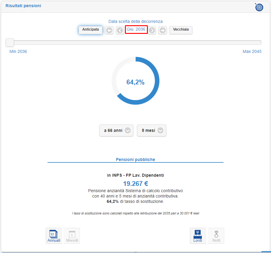 Considerando continuità lavorativa dal 1996 al pensionamento, Luca soddisfa i 3 requisiti richiesti per il pensionamento anticipato interamente contributivo. Pertanto, si stima che l’accesso al pensionamento sarà a giugno 2035 quando per effetto dell’adeguamento alla speranza di vita, sulla base dello scenario mediano base 2018, il requisito anagrafico sarà di 65 anni e 4 mesi.
