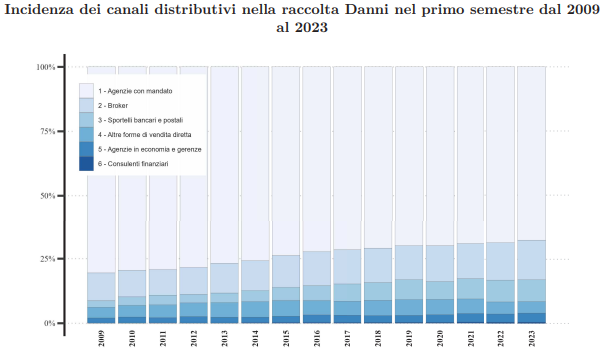 Nei primi sei mesi del 2023 i Broker e le Agenzie in economia e gerenze mostrano una crescita della quota di premi intermediati rispetto al totale (rispettivamente del 15,4% e 3,5%); le Agenzie con mandato riducono il loro peso, che comunque si attesta poco sotto il 68%.