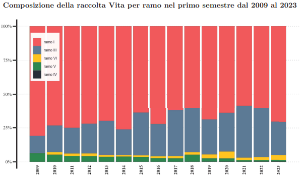 Il calo della raccolta Vita è principalmente dovuto all’andamento del ramo III (-36,4% rispetto al primo semestre 2022), mentre il ramo I registra un incremento del +10,2%, che corrisponde ad un’incidenza di circa il 70% sul totale dei premi raccolti; prosegue l’incremento della raccolta legata ai Fondi di ramo VI, che rimangono limitati ad una quota ridotta del totale.