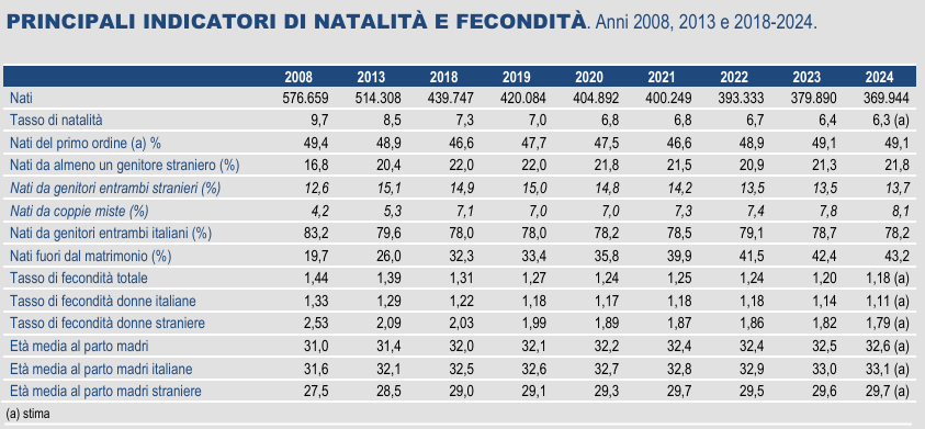 Nel 2024 i nati residenti in Italia sono 369.944, quasi 10mila in meno rispetto al 2023. La variazione relativa sull’anno precedente (-2,6%) è in linea con la variazione percentuale media annua registrata dal 2008 al 2023 (-2,7%). Il tasso di natalità nel 2024 è pari a 6,3 per mille residenti (era 9,7 per mille nel 2008). L’andamento decrescente delle nascite prosegue senza soste dal 2008, anno nel quale si è registrato il numero massimo di nati vivi degli anni Duemila (oltre 576mila). Da allora la perdita complessiva è stata di quasi 207mila nascite (-35,8%).