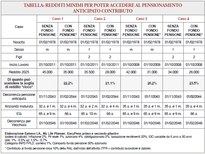 Pertanto, per raggiungere il montante soglia e sufficiente un reddito inferiore se si e iscritti a un fondo pensione cui si e versato per tempo e a sufficienza. La tabella indica i redditi minimi per poter accedere al pensionamento anticipato contributivo. Con le nuove norme la pensione anticipata contributiva, attualmente raggiungibile solo per redditi medio-alti, diventa accessibile a una platea più ampia. Anche chi ha redditi più contenuti, infatti, potrà decidere se ritirarsi prima dell’età di vecchiaia a patto di aderire presto al fondo pensione, versando il Tfr maturando e la contribuzione a carico del lavoratore e del datore di lavoro.