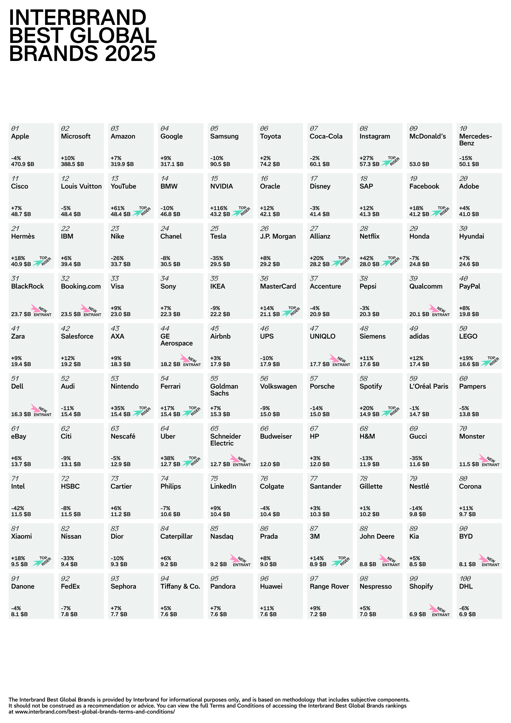 Tra i brand che sanno cavalcare l’onda dell’innovazione ci sono quelli il cui valore è in rapida ascesa all’interno della nostra classifica: NVIDIA (#15, +116%), Netflix (#28, +42%), YouTube (#13, +61%), Uber (#64, +38%), Nintendo (#53, +35%) e Instagram (#8, +27%). Come pure BlackRock (#31), Booking.com (#32), Qualcomm (#39), GEAerospace (#44), UNIQLO (#47), Schneider Electric (#65), Monster (#70), Nasdaq (#85), BYD (#90) e Shopify (#99), che hanno fatto il loro ingresso nella Best Global Brands 2025, segnando il numero di debutti più alto di sempre nella nostra classifica.