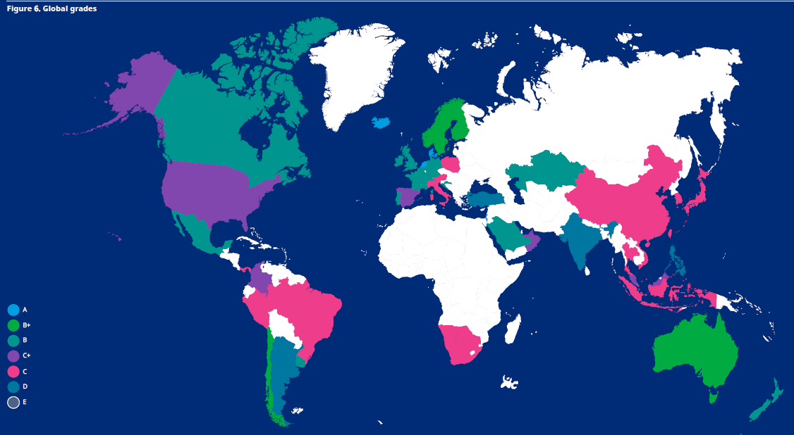 I Paesi che hanno ottenuto un punteggio superiore a 80 hanno ricevuto il grado massimo di valutazione, A. Questi Paesi offrono sistemi di reddito da pensione solidi, capaci di garantire buone prestazioni, sostenibilità e un elevato livello di integrità.