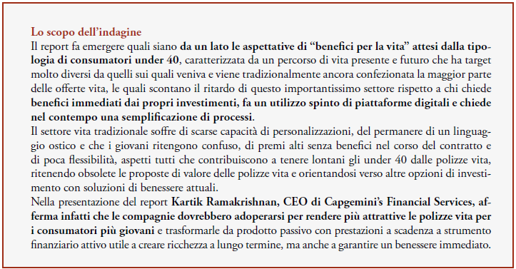 - reinventare i prodotti come soluzioni. Le compagnie assicurative possono offrire ciò che i concorrenti non hanno: soluzioni finanziarie integrate che combinano protezione, accumulo di ricchezza ed efficienza fiscale e che gli under 40 apprezzano sempre più rispetto a offerte frammentarie