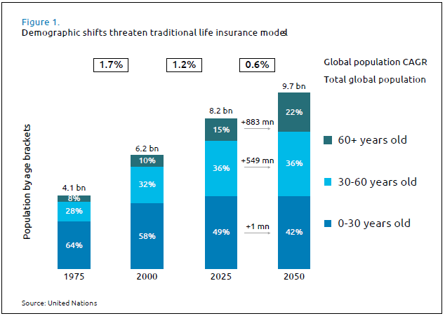 - Lenta crescita economica e incertezza finanziaria (51%) (Figura 1: I cambiamenti demografici minacciano i modelli tradizionali di assicurazione sulla vita)