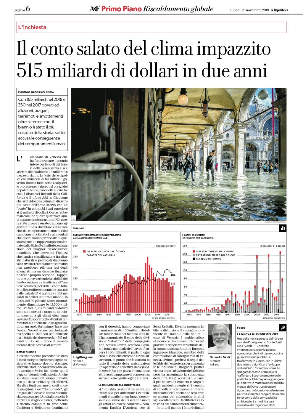 L’alluvione di Venezia che ha fatto tremare il mondo intero per le sorti del tesori della Serenissima e si è lasciata dietro almeno un miliardo e mezzo dl danni. La “crisi delle cipol-le’ che minaccia dl far saltare il governo Modi in India sotto i colpi delle proteste per il rialzo del prezzi del popolare bulbo, base della cucina locale. I disastrosi incendi della California e iI tifone Jebi in Giappone che si dividono la palma dl disastro più costo dell’anno scorso con un “conto” in entrambi i casi superiore al 12 miliardi di dollari. Cos’avrebbero in comune queste quattro calamità apparentemente naturall? Di essere state invece causate o almeno aggravate fino a diventare catastrofiche dai comportamenti umani e dai cambiamenti climatici e ambientali che questi hanno provocati: di questo è sicuro un rapporto appena sfornato dallo Swiss Re Institute, emanazione del maggior riassicuratore mondiale.