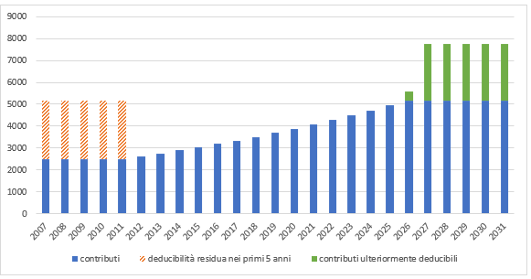 Ai lavoratori di prima occupazione successiva alla data del 1° gennaio 2007, ossia soggetti che al 01.01.2007 non erano iscritti presso un qualsiasi ente di previdenza obbligatoria, limitatamente ai primi cinque anni di partecipazione alle forme pensionistiche complementari, è consentito, nei venti anni successivi al quinto anno di partecipazione a tali forme, dedurre dal reddito complessivo contributi eccedenti il limite di 5.164,57 euro pari alla differenza positiva tra l’importo di 25.822,85 euro e i contributi effettivamente versati nei primi cinque anni di partecipazione alle forme pensionistiche e comunque per un importo non superiore a 2.582,29 euro annui. Dunque la deduzione dal reddito complessivo dei contributi versati a FPC non può superare in alcun caso l’importo di 7.746,86 euro annui. Si tratta di una facoltà concessa ai lavoratori neo – occupati successivamente al 1° gennaio 2007, al fine di incentivare l’adesione alla previdenza complementare. Supponiamo che un soggetto abbia versato per i primi cinque di adesione al fondo pensione contributi pari a 2.500 euro (12.500 euro l’anno), dal sesto anno il limite di deducibilità è maggiorato di 13.322,85 euro.
