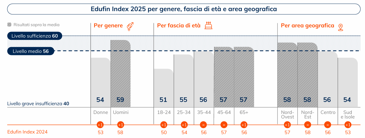 Sono gli uomini, over 45 e residenti al Nord a raggiungere livelli superiori alla media, con un gender gap che si stabilizza a 5 punti (uomini 59 vs donne 54). Si riducono invece i divari per area geografica e per età: cresce di un punto l’alfabetizzazione finanziaria degli abitanti del Sud e delle Isole (54 nel 2025 vs 53 nel 2024), e si registra lo stesso incremento tra i giovani in fascia 25-34 anni (55 nel 2025 vs 54 nel 2024). Entrambi i progressi, seppur contenuti, riflettono gli effetti positivi delle iniziative di sensibilizzazione e formazione promosse da enti pubblici e privati.