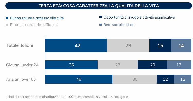 Gli over 65 guardano al futuro con più curiosità e fiducia e considerano come fattori rilevanti: salute, autosufficienza, progetti da realizzare e legami familiari. Accanto agli aspetti più concreti legati alla salute e alle finanze, i giovani (18-24 anni) sentono come rilevanti anche aspetti ludici come svago, attività di valore e una rete sociale forte. In questo quadro generale, tuttavia, permane molta incertezza su chi, in futuro, si prenderà cura degli anziani: anche tra coloro che già oggi assistono quotidianamente i propri cari – il 39% degli italiani – vi è poca fiducia di ricevere assistenza quando ne avranno bisogno.