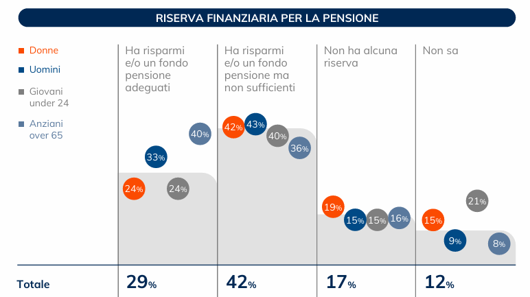 Con un’aspettativa di vita media che ha raggiunto gli 84 anni, undici in più rispetto ai 73 del 1975, è evidente la necessità di prepararsi alle nuove sfide sociali, economiche e previdenziali che ne derivano. La ricerca ha indagato come gli italiani guardano al proprio futuro in un Paese sempre più longevo, analizzando il livello di conoscenze finanziarie e la capacità di pianificare la terza età sotto il profilo economico e assicurativo. E’ emersa preoccupazione e incertezza, in particolare tra giovani e donne, che temono di non poter mantenere il proprio tenore di vita dopo la pensione a causa di risparmi ritenuti insufficienti per affrontare una silver age serena ed economicamente sicura.