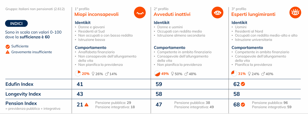 1. Miopi e inconsapevoli (20% della popolazione) – Donne e giovani, residenti al Sud, bassi livelli di istruzione e reddito, analfabeta finanziario (Edufin Index 41), scarsa consapevolezza dell’allungamento della vita (Longevity Index 43) e assenza di pianificazione previdenziale (Pension Index 21).
