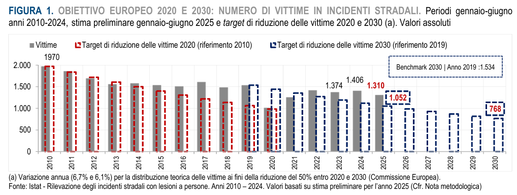 Nel confronto con i primi sei mesi del 2019 — anno di riferimento scelto dalla Commissione Europea per il programma “Road Safety Policy Framework 2021-2030”, che fissa come obiettivo intermedio la riduzione del 50% del numero di vittime e feriti gravi entro il 2030 — si registra un calo contenuto degli incidenti stradali (-1,5%) e dei feriti (-5,0%) e una riduzione più marcata dei decessi (-14,6%).