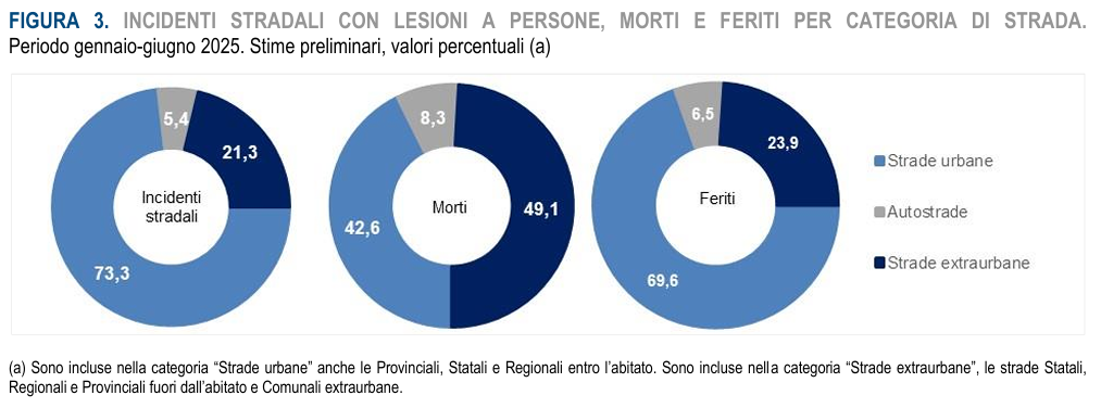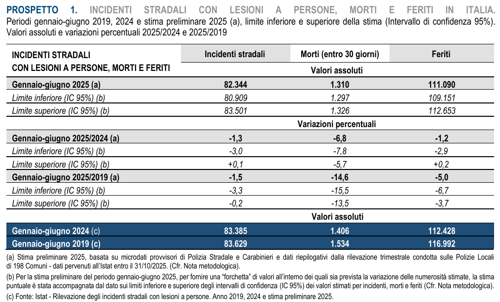 Secondo le stime preliminari rese note dall’ISTAT, nel I semestre 2025 si registra, rispetto allo stesso periodo del 2024, una diminuzione del numero di incidenti stradali con lesioni a persone (82.344; -1,3%), dei feriti (111.090; -1,2%) e, più consistente, delle vittime entro il trentesimo giorno (1.310; -6,8%).