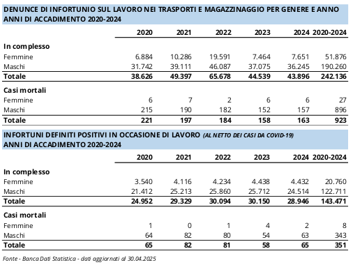 Tra il 2020 e il 2024 sono state presentate all’Inail oltre 242mila denunce per infortuni avvenuti nel settore dei Trasporti e magazzinaggio, con 923 casi mortali. Rispetto al 2020 il totale delle denunce è cresciuto del 13,6%, con un incremento particolarmente marcato per gli infortuni occorsi in itinere, nel tragitto casa-lavoro-casa (+45,4%), mentre quelli in occasione di lavoro hanno registrato un aumento dell’8,8%. A rilevarlo è il nuovo numero di Dati Inail, periodico curato dalla Consulenza statistico attuariale dell’Istituto, che aggiorna l’analisi su uno dei comparti produttivi più esposti a rischi lavorativi, che tra il 2024 e i primi mesi di quest’anno si è trovato a operare in uno scenario economico, geopolitico e normativo molto complesso.