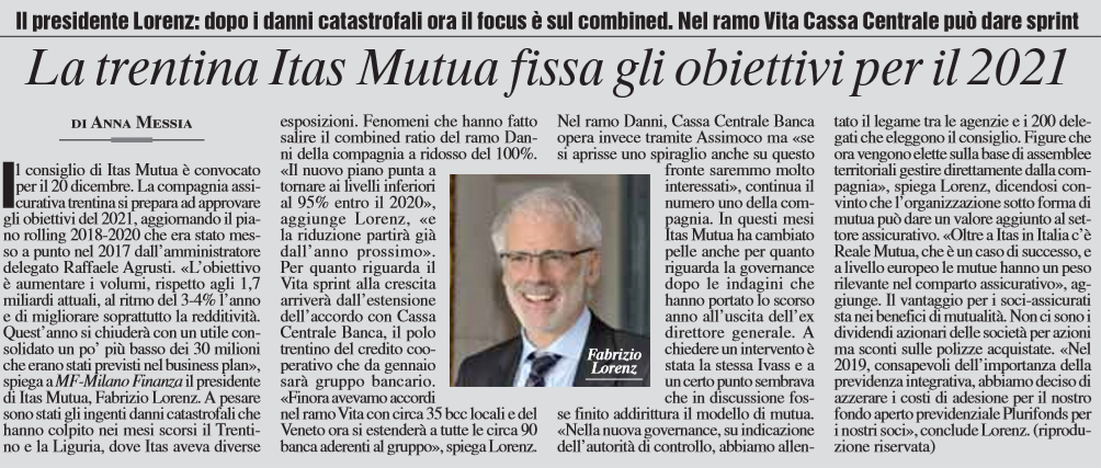 Il consiglio di Itas Mutua è convocato per il 20 dicembre. La compagnia assicurativa trentina si prepara ad approvare gli obiettivi del 2021, aggiornando il piano rolling 2018-2020 che era stato messo a punto nel 2017 dall’amministratore delegato Raffaele Agrusti.