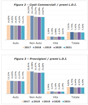 Se si analizzano i singoli settori, l’indicatore risulta in aumento, rispetto al 2020, per i rami non Auto (da 21,44% a 21,56%), mentre diminuisce sia per il ramo Auto (da 12,97% a 12,74%) sia per i rami Vita (da 2,24% a 2,19%).