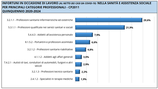 Oltre una denuncia su cinque riguarda casi avvenuti in itinere, nel tragitto di andata e ritorno tra la casa e il luogo di lavoro. Gli infermieri risultano la categoria più colpita (circa il 30% delle denunce), seguiti da operatori sociosanitari e socioassistenziali. A distanza gli operatori socioassistenziali e gli ausiliari ospedalieri. I medici nelle loro diverse specializzazioni denunciano circa il 5% degli infortuni.