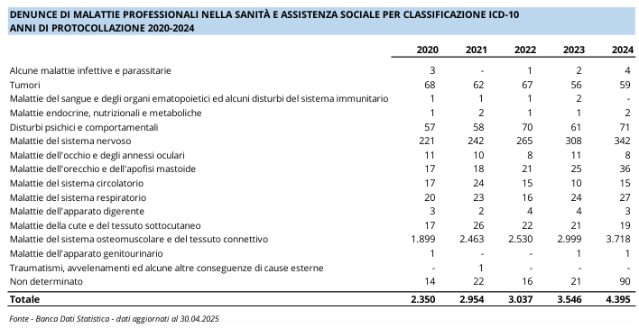 Per quanto riguarda le malattie professionali, nel 2024 nel settore della Sanità e assistenza sociale ne sono state denunciate 4.395, con un incremento del 23,9% rispetto al 2023, superiore di due punti percentuali alla crescita registrata nell’Industria e servizi. Le tecnopatie riguardano in larga maggioranza lavoratrici (77% nel quinquennio) e in otto casi su 10 colpiscono i lavoratori e le lavoratrici over 50.