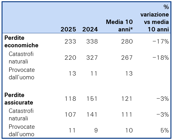 L’uragano Melissa è attualmente l’uragano che ha provocato più danni del 2025, con perdite assicurate stimate fino a 2,5 miliardi di dollari, secondo la stima dello Swiss Re Institute. La stagione dei cicloni tropicali nell’Atlantico settentrionale ha visto 13 tempeste a cui è stato dato un nome, 5 uragani, 4 uragani di grande intensità e tre uragani di categoria 5 (Erin, Humberto e Melissa). Per la prima volta in dieci anni, nessuno di questi uragani ha colpito la costa degli Stati Uniti, il che spiega perché le perdite assicurate derivanti da questo pericolo dovrebbero essere basse nel 2025.